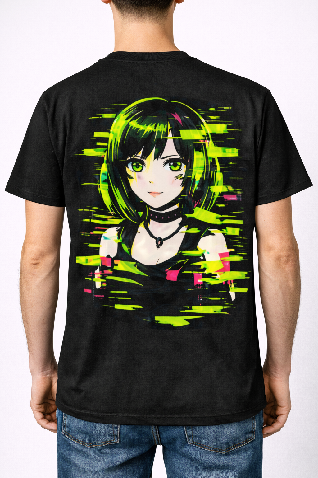 Unique Graphic Design: Features a high-quality anime character print accented with vibrant neon green and pink “glitch” effects, creating a striking visual impact against the deep black fabric.